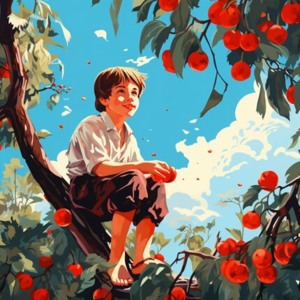 Așa că băiatul își ia rămas bun de la mătușă și se strecoară în grădină cu gândul că trebuie să ia cât mai repede cireșe, apoi să se facă nevăzut. Însă, după un timp, se trezește la tulpina copacului cu mătușa Mărioara tare supărată, amenințându-l cu o nuia în mână: „Stai, măi porcane, că te căptușește ea, Mărioara, acuș!”
